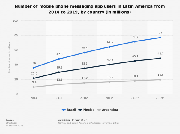Dados levantados pela Statista mostram que 56% da população brasileira faz uso do WhatsApp, desde 2017. O gráfico abaixo mostra uma comparação do uso de aplicativos de mensagens no Brasil, México e Argentina ao longo de seis anos. O Brasil mostra o maior crescimento.